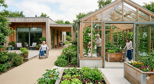 Raised masonry beds that allow you to enjoy gardening at a comfortable height, finished in premium materials like resin-bound gravel that is easy on a wheelchair or walking frame.